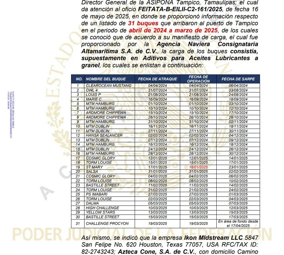 De acuerdo con las investigaciones de la FGR, al menos ocho buques arribaron a Tampico entre el 21 de febrero de 2025 y el 19 de marzo de 2023 cuando ya era el director general de la ANAM.