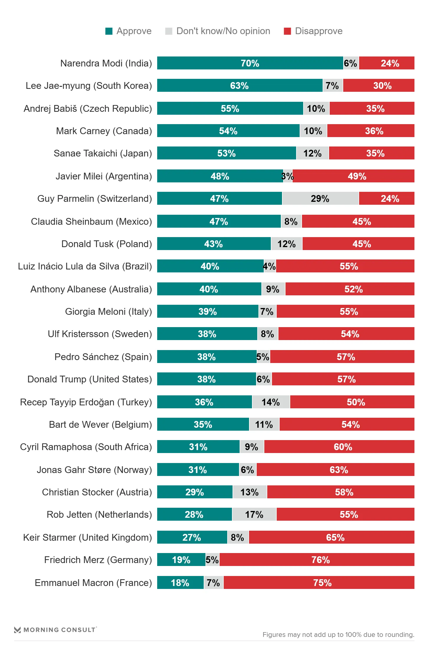 La cifra no es menor. Se trata de una medición global que compara bajo la misma metodología a líderes de distintas regiones. En ese ranking, Sheinbaum aparece lejos del 70% que mantiene Narendra Modi y se ubica en un punto medio donde la aprobación ya no es dominante, sino frágil. Más que un dato aislado, es el punto más reciente de una tendencia descendente.